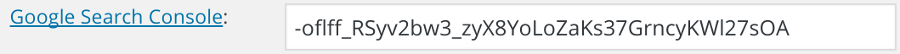 - In the field labeled “Google Search Console“, paste in that verification code you copied from the Google dashboard and then click “Save Changes“. It should look similar to the following image after you save your changes (the code will be different):