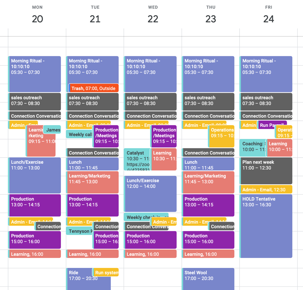 I no longer have to think about what I should be doing. It’s all there on my calendar. I revisit my activities every couple of months to make sure everything is still aligned with my business needs (for example moving more slots allotted to Learning/Marketing to sales or production if needed or moving my evening exercise to mid-day once the temperatures drop next winter).